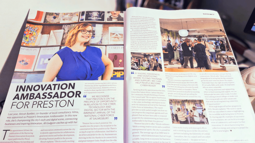 Shirah was appointed by Preston City Council to act as their Innovation Ambassador to represent Preston and raise its profile as a hub for innovation, tech and digital businesses. Acting as a single point of contact, Shirah engages with partner organisations and SMEs to identify opportunities for collaboration, good news stories, and further development.
